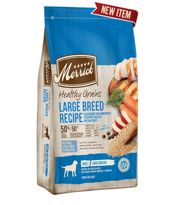 Merrick Healthy Grains Large Breed Recipe Dry Dog Food provides balanced nutrition with real whole foods sourced from local farmers we know and trust. This recipe is specially balanced with 50% protein + healthy fat ingredients so dogs get optimal protein and fiber.